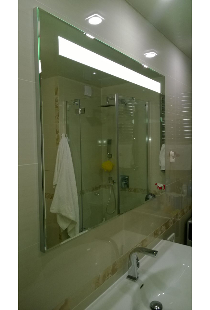 Настенное зеркальное полотно выполнено из качественного влагоустойчивого материала. Большое зеркало будет отлично смотреть в просторной ванной комнате. При необходимости его можно оформить в рамку.