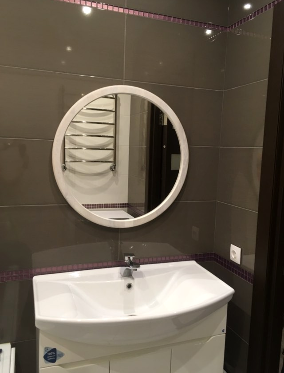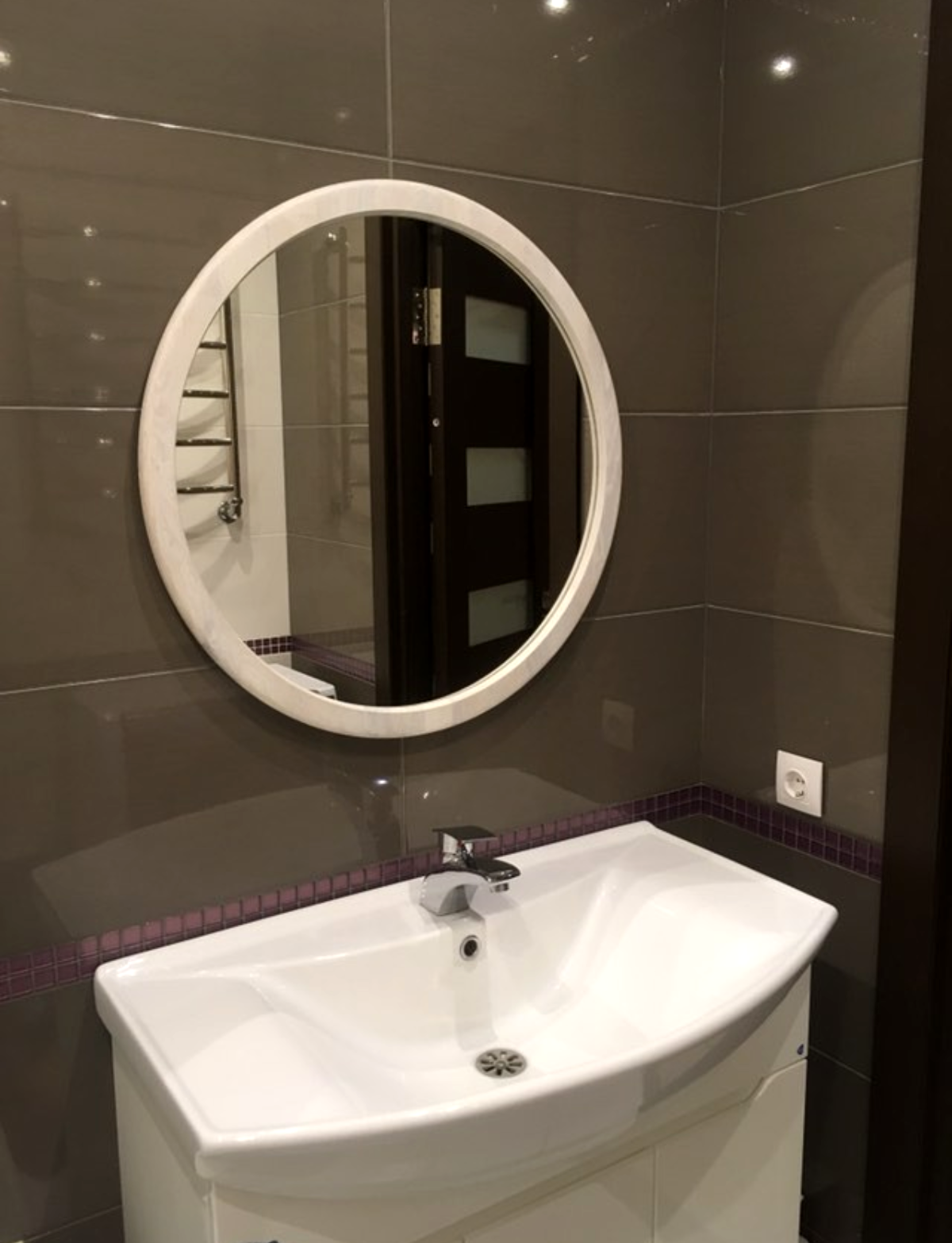 На фото круглое зеркало диаметром 700 мм, ширина рамки – 40 мм. Размер указан с учётом рамки.