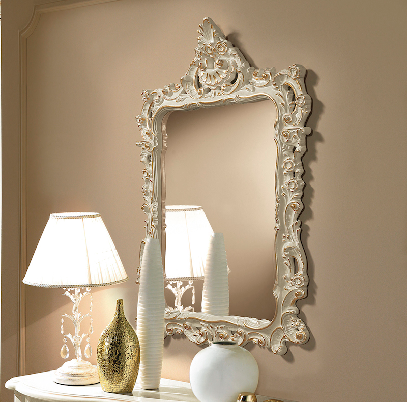 Роскошное навесное зеркало в барочном стиле. Рама в белом покрытии с золотистой патиной.