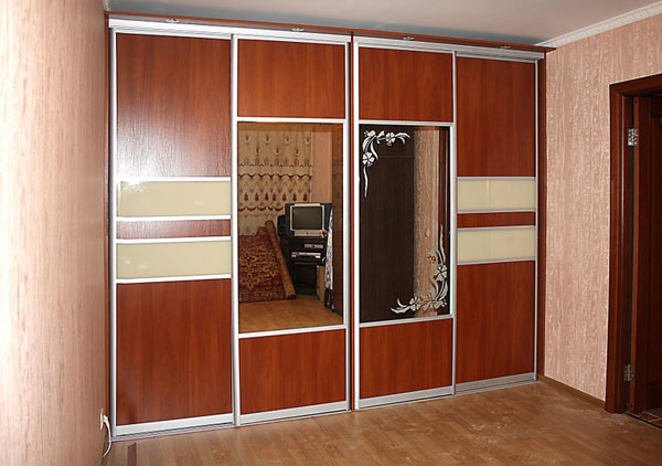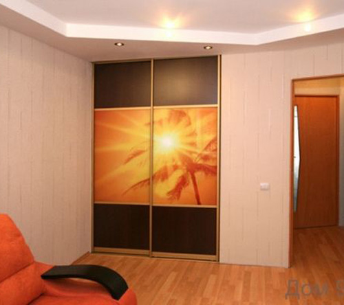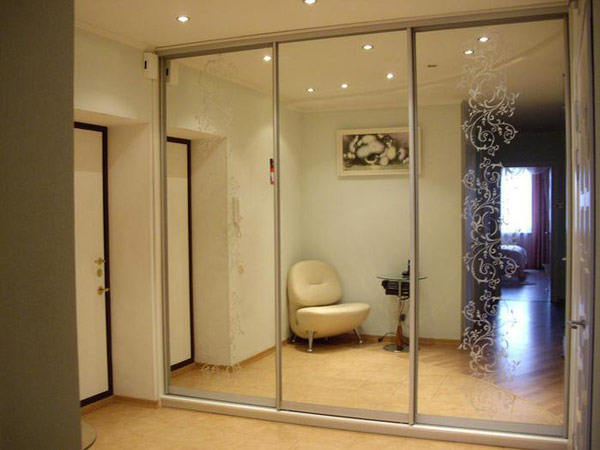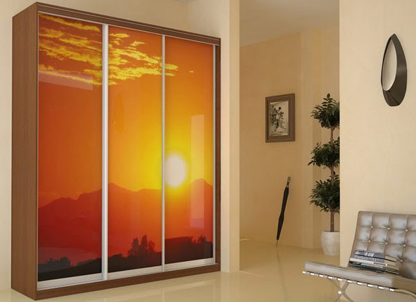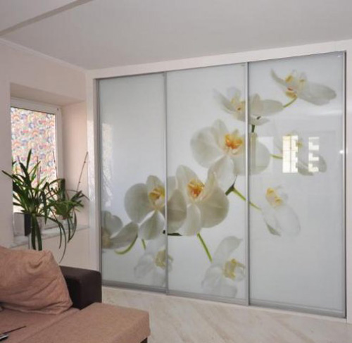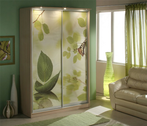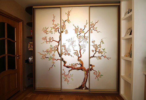 Встроенный линейный шкаф-купе с рисунком на зеркале
