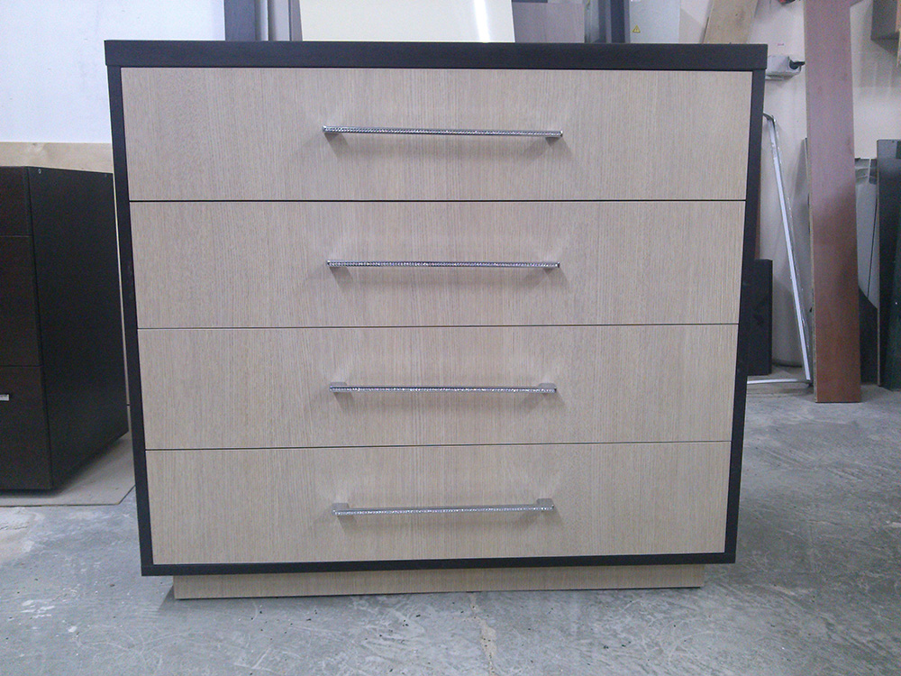 Большое количество выдвижных ящиков. Фасад светлого цвета, ручки - бронзового.