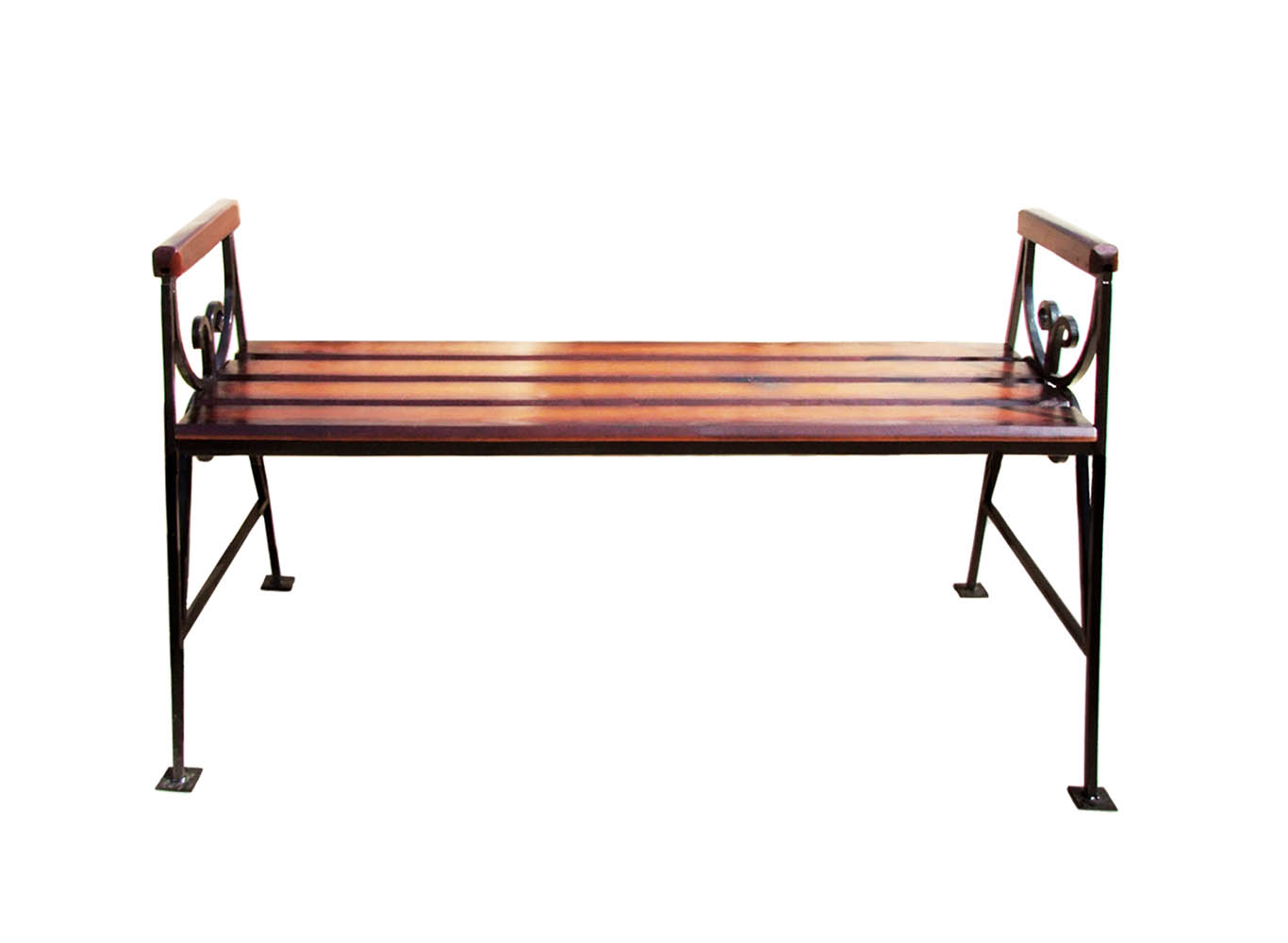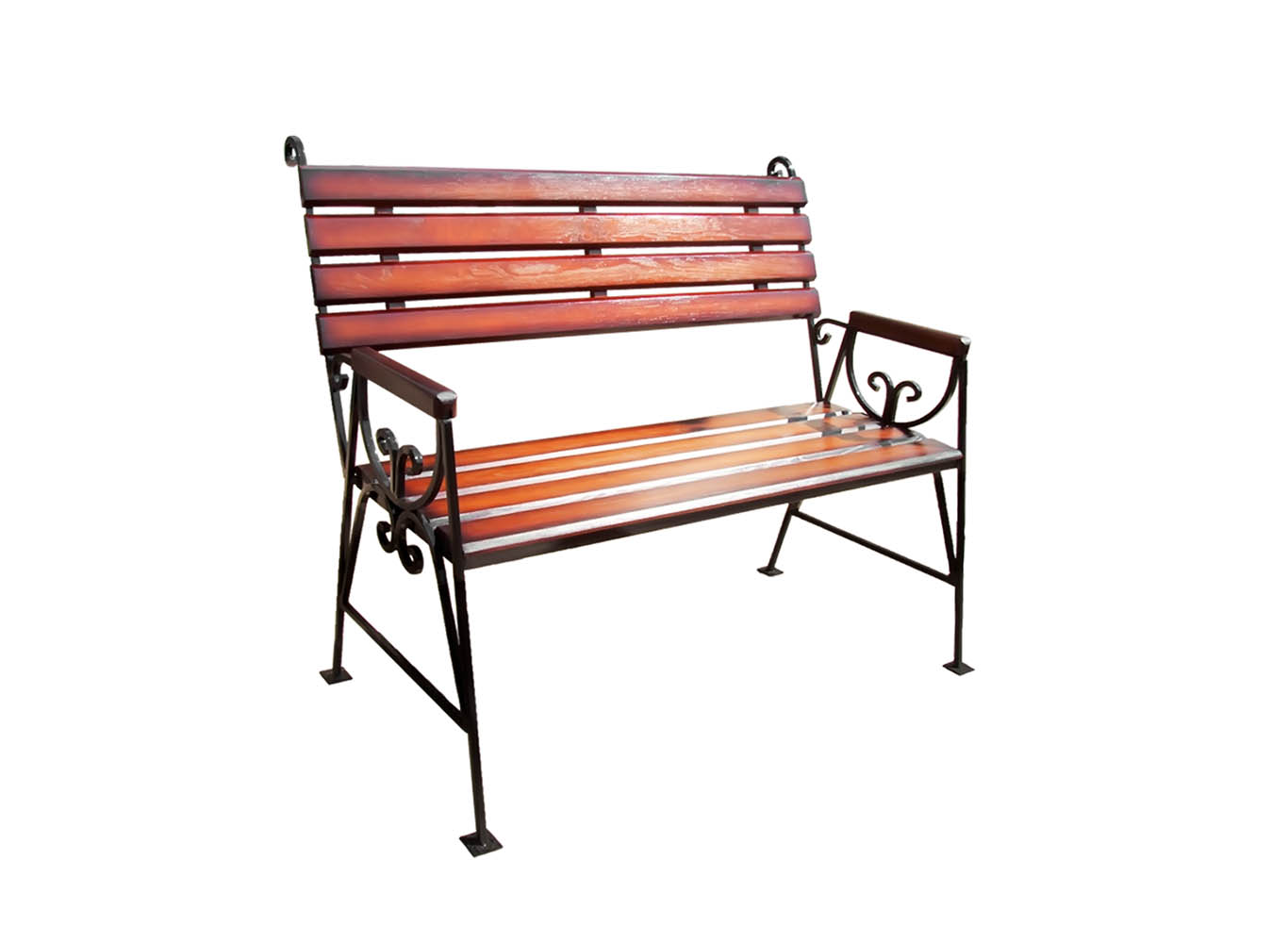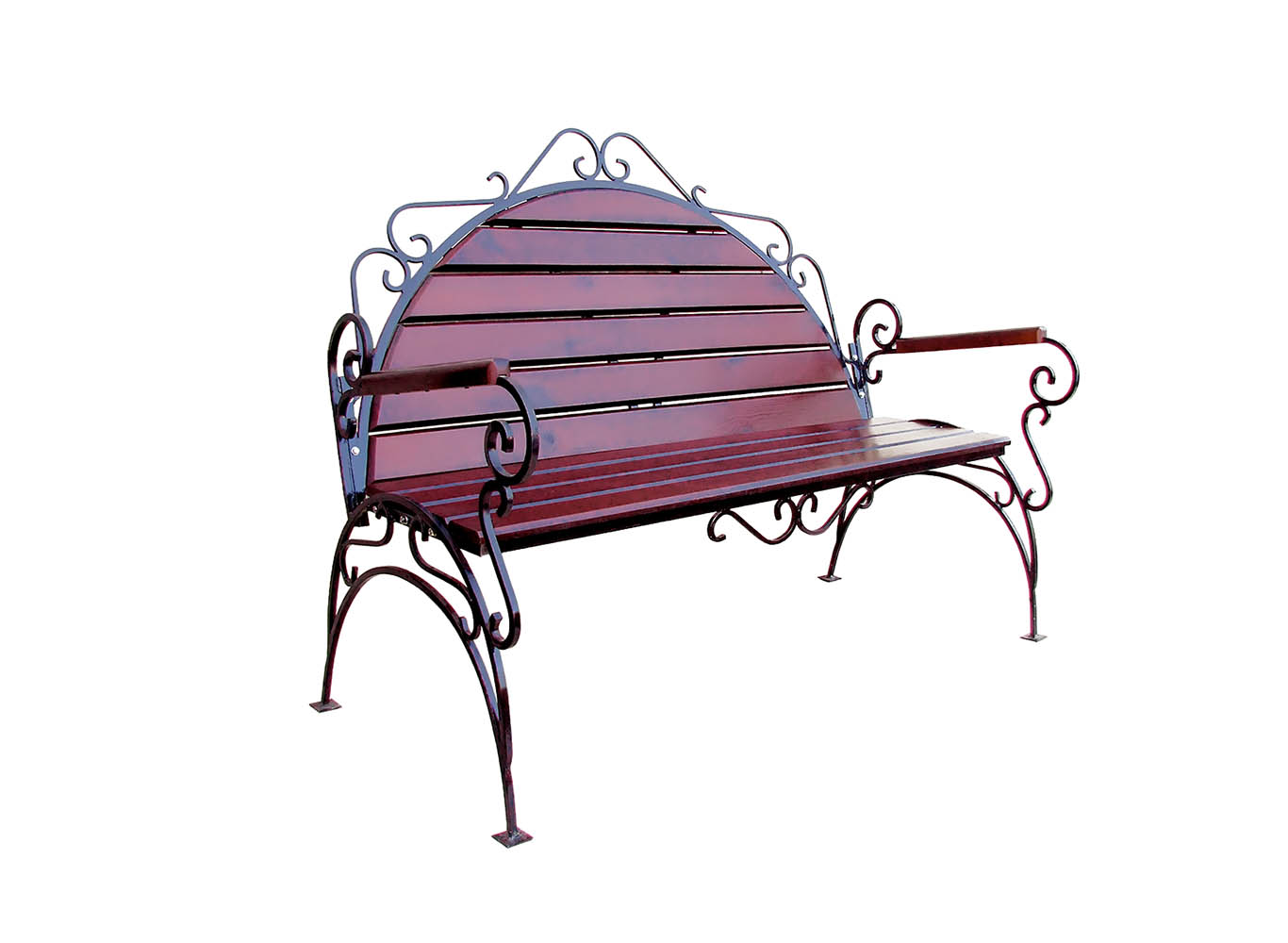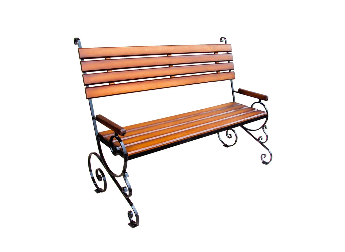 Просторная скамья со спинкой. Каркас - сталь, пиломатериал сидения и спинки - массив дерева лиственных пород.