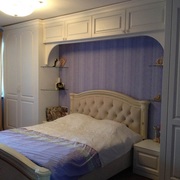 Встроенная арка с антресолью. Фигурное изголовье кровати с мягкой набивкой в стяжке.