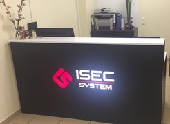 Прямая рецепция для администратора в черном фасаде с подсветкой и белой столешницей.
