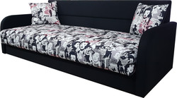 Небольшой раскладной диван с принтом на тему европейской архитектуры.