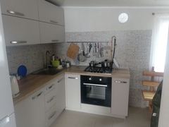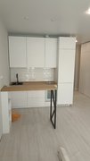 Компактная кухня. Линейная конструкция. Комбинация оттенков.