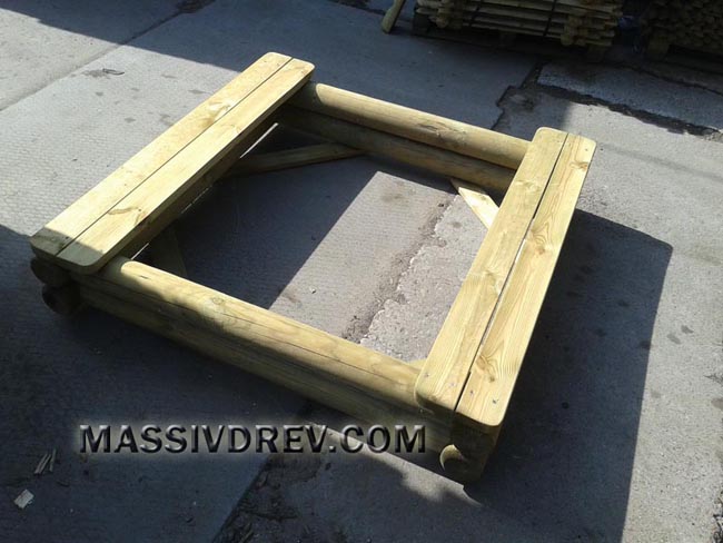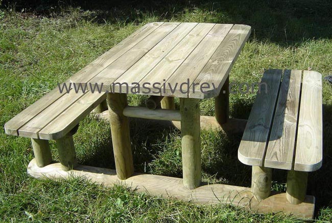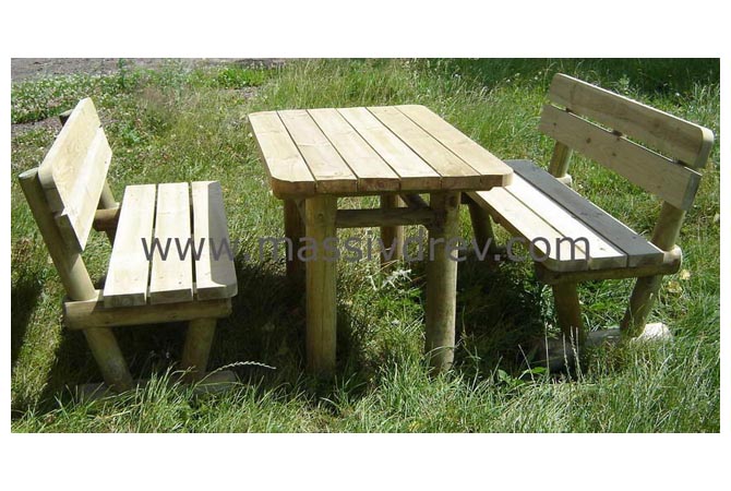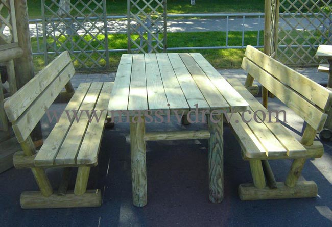 В комплекте стол и два скамьи со спинкой. Материал: срубы сосны.