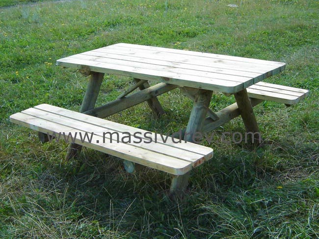 Единая конструкция со столом и скамьями без спинок. Широкая столешница.