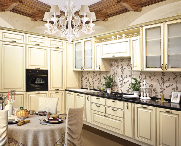 Классический стиль оформления. Белые фасады с золотистым декором.