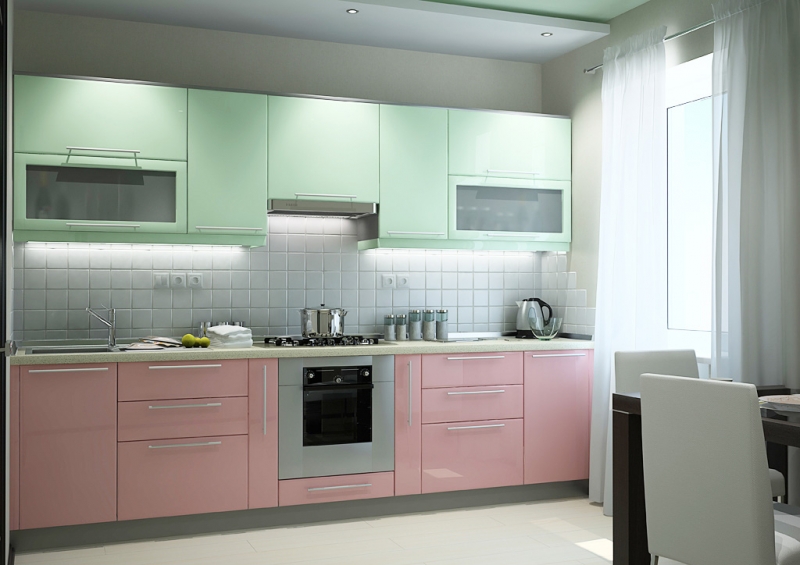 Компактный гарнитур ярко-розового цвета. Стеклянные вставки и фурнитура черного цвета