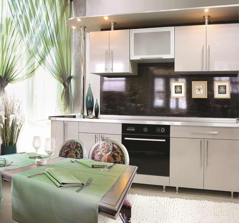 Комбинированные фасады без ручек. Подсветка рабочей зоны