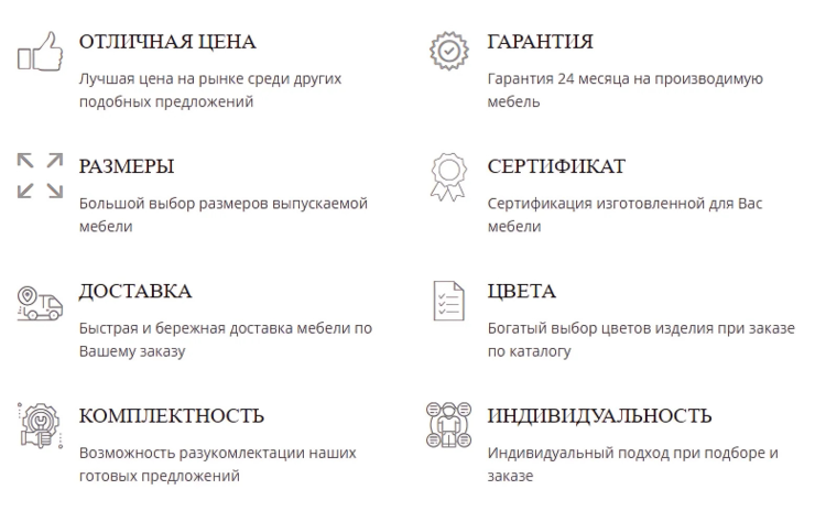 Наш лозунг – «Мебель доступная каждому!» для нас не пустые слова, мы боремся за качество продукции, не завышая цены ! Мы производим качественную, удобную и функциональную мебель по таким низким ценам, чтобы как можно больше людей имели возможность её купить! Наше предприятие так же занимается оптовой реализацией по очень выгодным ценам, и изготовлением мебели, а в частности кухонь, по индивидуальным заказам! Благодаря невысокой цене и достойному качеству выпускаемой продукции количество постоянных клиентов неизменно растет! Наша продукция сделает Ваш дом уютным и комфортным, и будет радовать Вас в течение многих лет.