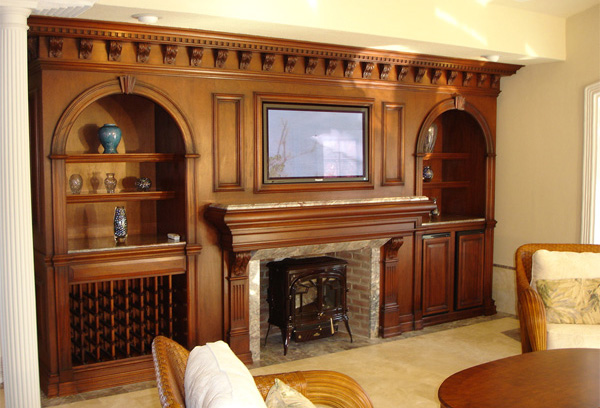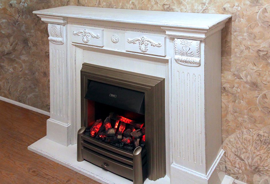Отделка камина из натурального массива. Панели светлоокрашеные в классическом стиле.