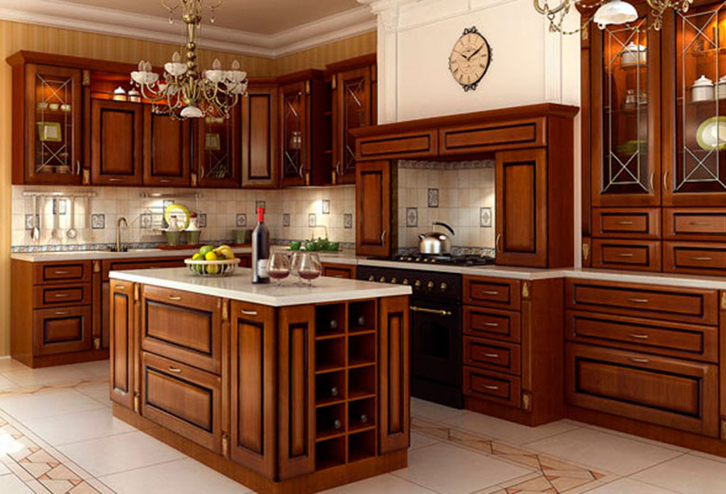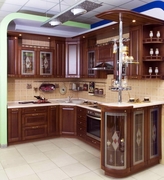 Натуральный массив. Деревянные столешницы, светлоокрашенный фасад. Шкафчики с остеклением.