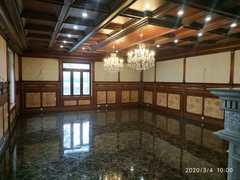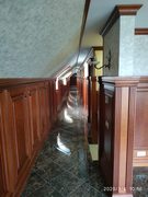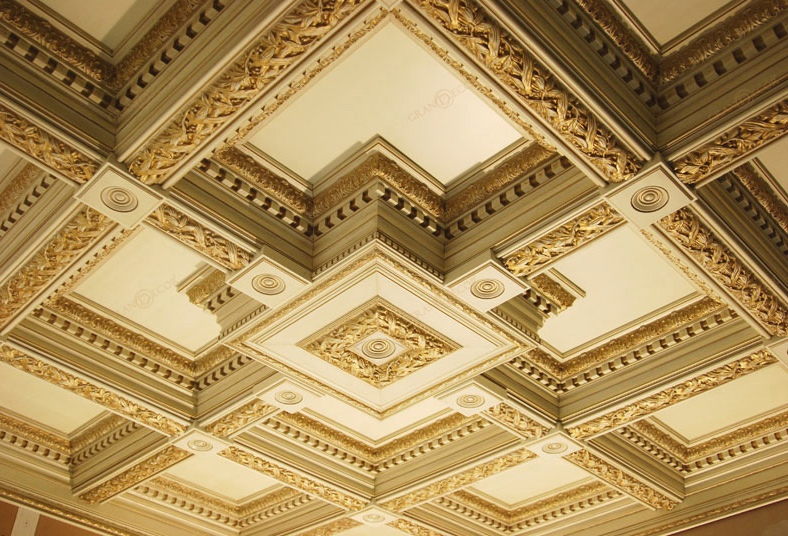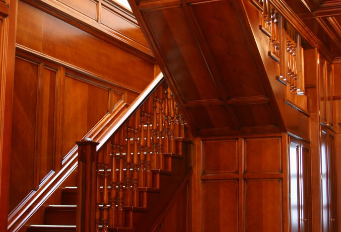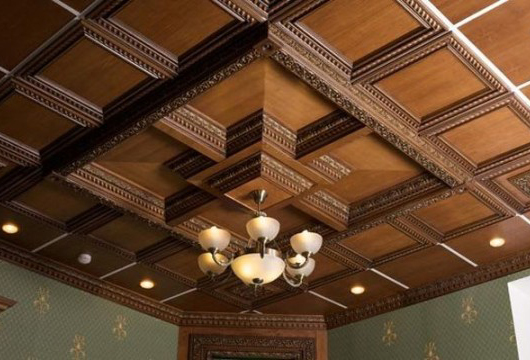 Панели из массива на потолок темных тонов с резными плинтусами.