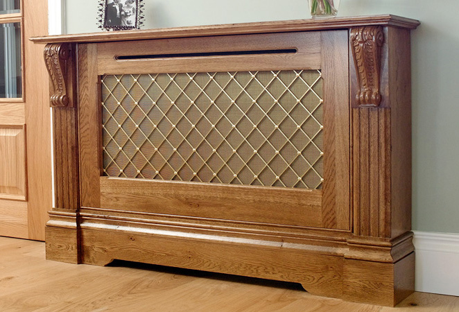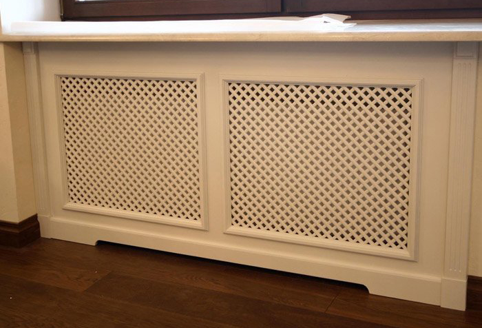 Панели на радиатор из светлоокрашенного древесного массива с сеточным фасадом.