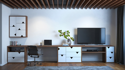 Корпус под орех и белые фасады с треугольными выемками для удобного открытия.