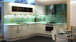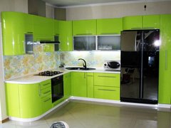Глянцевые фасады белого, оранжевого и салатового цвета. Есть ниши для встроенной техники.