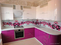 Изысканная угловая кухня в белом и розовом цвете