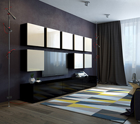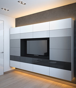 Ниша для ТВ, открытые полки, выдвижные ящики, зеркала по бокам.