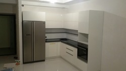 Гарнитур из акрила с местом для холодильника. Черная глянцевая столешница.