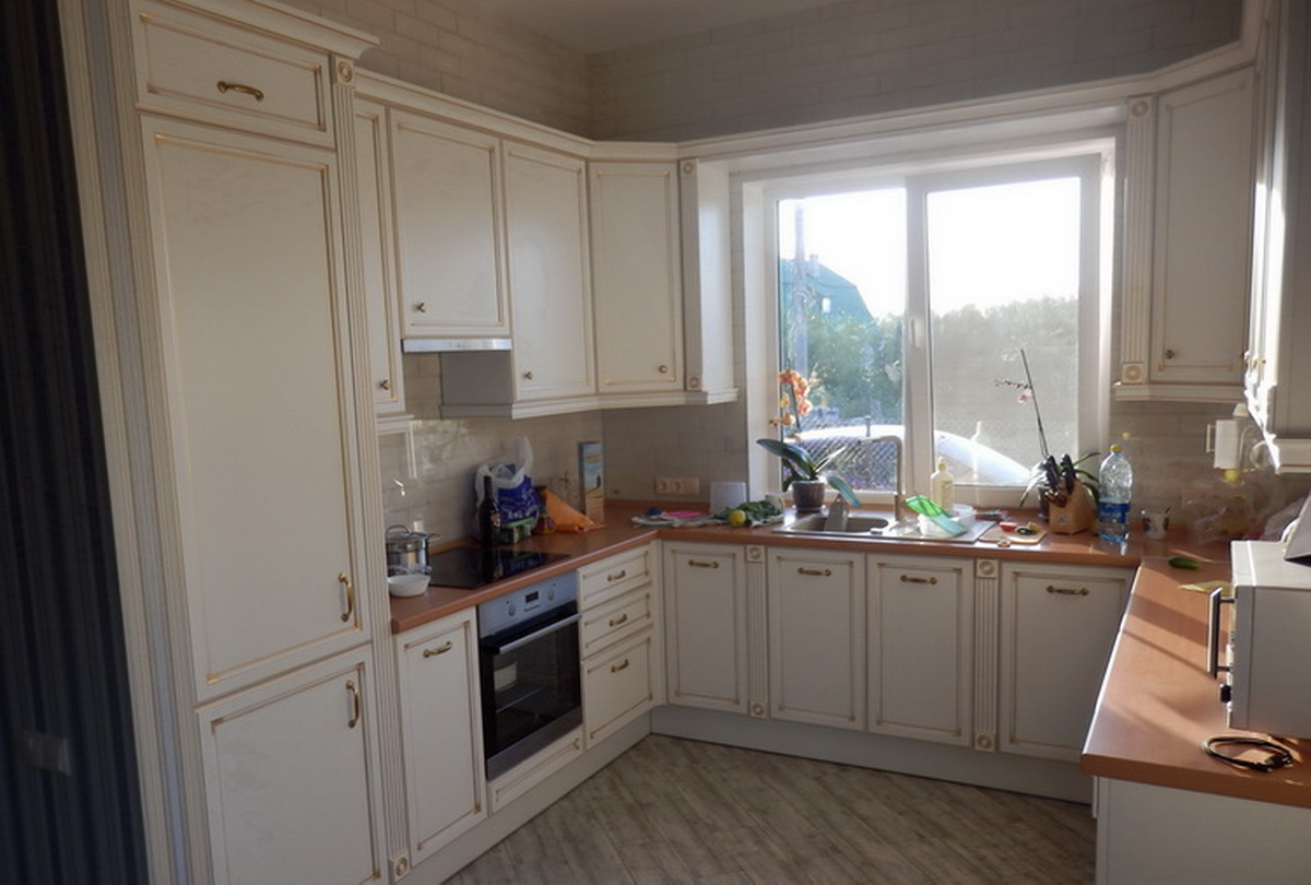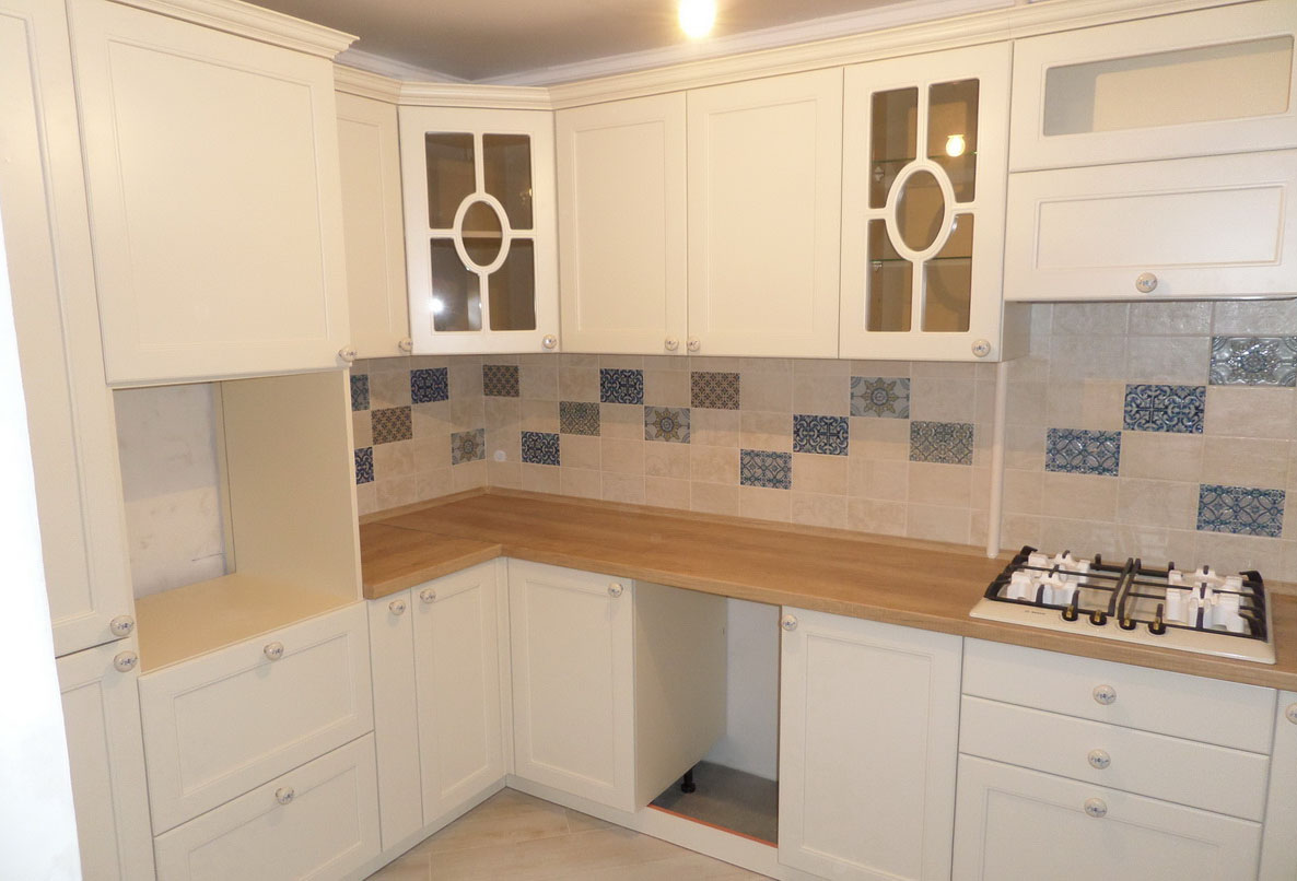 Цветной фасад из МДФ - патина. Остекленные дверцы верхних шкафчиков.