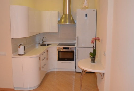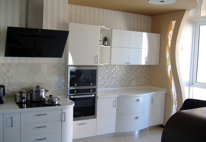 Белый радиусный фасад и столешницы. Есть ниша для духового шкафа.