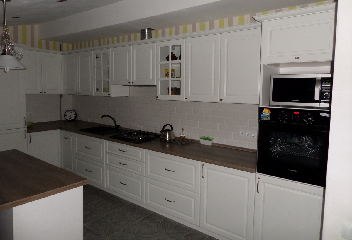 Белый матовый фасад, столешницы под дерево.