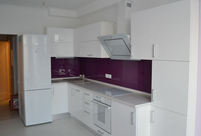 Фасад из белого крашенного МДФ, без ручек. Цветная столешница. Есть ниша для духового шкафа.