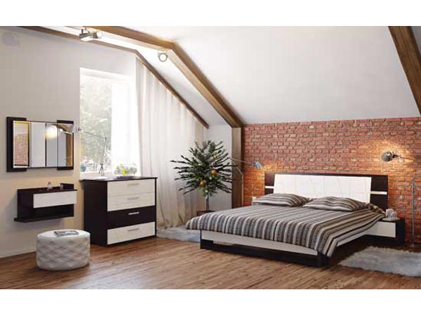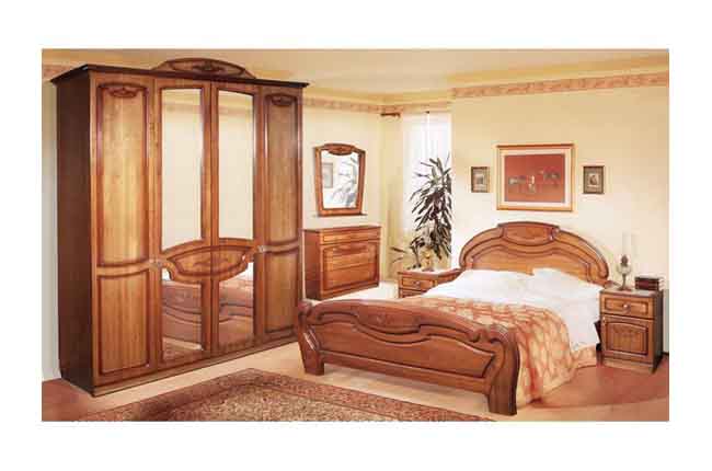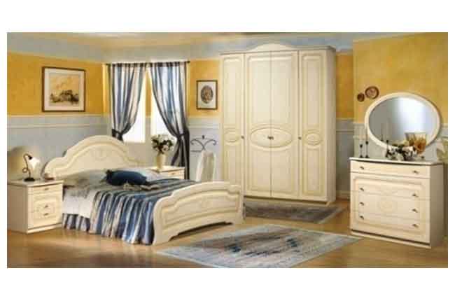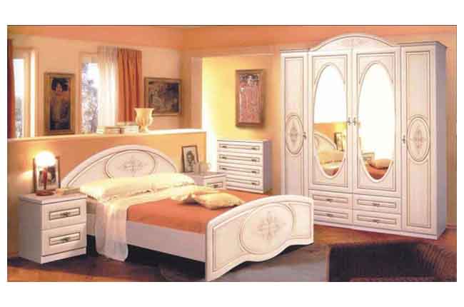 Комплектация: кровать, шкаф, комод, тумбочка, зеркало, фасады: МДФ, корпус: ламинированная ДСП.