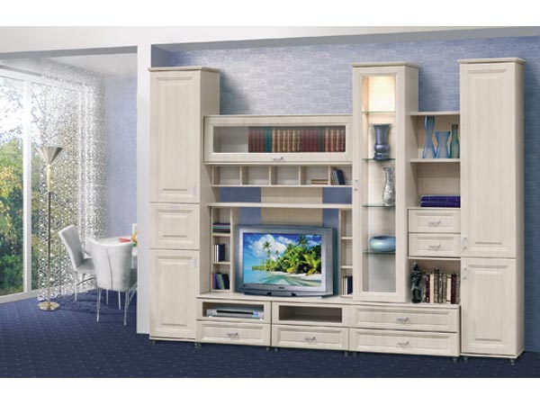 Габариты: 2100х3500х670, состав: витрина с нишей под TV, шкаф, два модуля для хранения вещей.