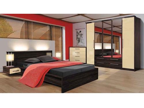 Комплектация: шкаф, кровать с тумбами, комод. Цвета: Хебан, Жёлтый глянец.
