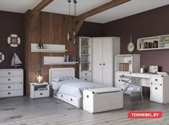 Коллекция включает в себя комод, тумбу, шкаф-пенал.