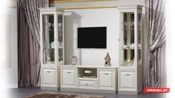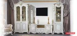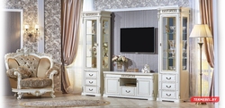 Гостиная в классическом стиле. Доступна в двух цветах. Фасады радиусные: МДФ с фрезеровкой и шелкографией.