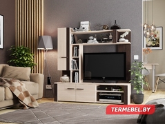 Компактная стенка с нишей для ТВ, открытыми полками, ящиками и шкафчиками.