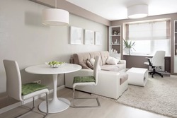 Стильная кухня-гостиная выдержана в трёх нейтральных цветах.