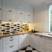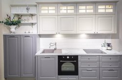 Дизайн кухонного гарнитура выполнен в стиле неоклассика.