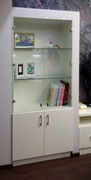 Верхний отдел с прозрачными дверцами и стеклянными полками. Низ - белый глянец.