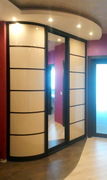 Бело-персиковой шкаф-купе с угловой радиусной секцией и сетчатым рисунком.
