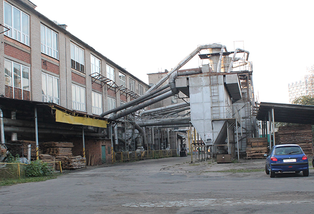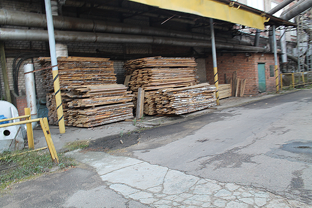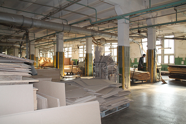 На фабрике есть два основных цеха: машинно-заготовительный и обойно-сборочный. Раскройно-пошивочный участок имеет три вспомогательных: энергоучасток, ремонтно-механический и транспортный участок. У входа в трехэтажное здание мы видим аккуратно сложенные доски.
