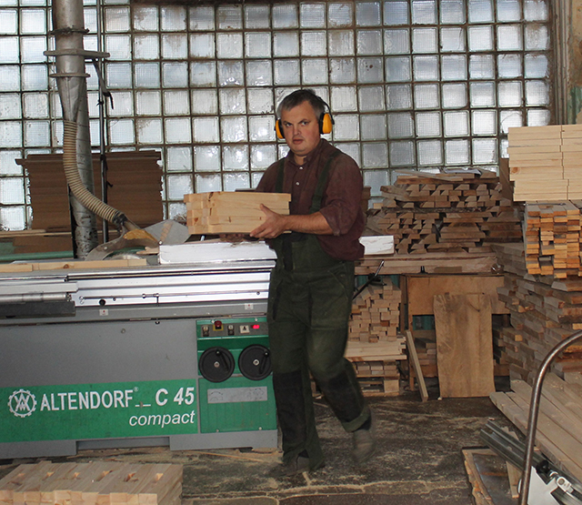– Вся наша мебель делается из натуральных древесных пиломатериалов. Это машинно-заготовительный участок. Здесь доски, которые мы видели на улице, обрабатывают, шлифуют и режут под нужные размеры, – объясняет ход рабочего процесса Сергей.