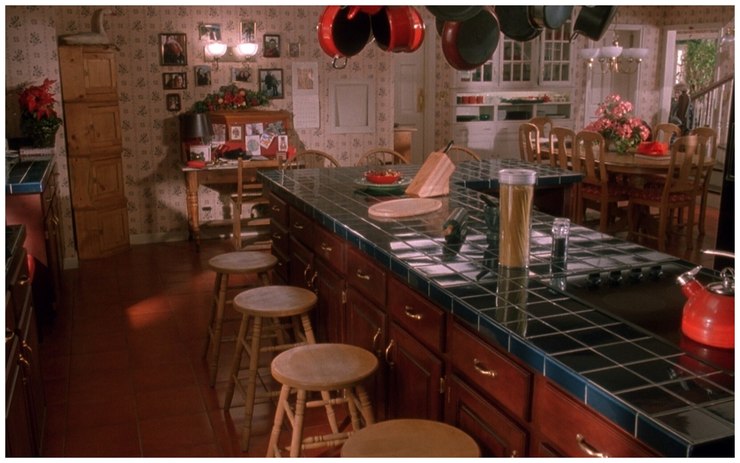 Центральное место в фильме занимает кухня. Она не объединена с гостиной, как это принято у американцев. Кухонный гарнитур классического стиля, массивный, выполненный в темном дереве, выглядит элегантно. Столешница из ДСП или МДФ, отсутствует, вместо нее зрители видят зеленовато-синюю столешницу из плитки. В США принято использовать много текстиля в интерьере, и кухня не является исключением. Кухонные шторки и тюль в фильме праздничного красного цвета. В помещении есть дверь для удобного и быстрого выхода на задний дворик.
