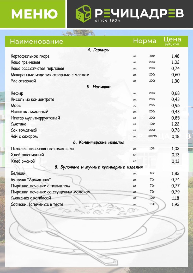 В официальном тг-канале производителя «Речицадрев» регулярно публикуется меню местной столовой. Посмотрим, что предлагают попробовать мебельщикам.