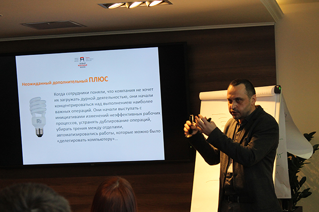 Затем Сергей Колесников, практикующий тренер-консультант в вопросах стратегического управления, построения и планирования деятельности компании, объяснил, как заставить сотрудников продуктивней работать в кризис.