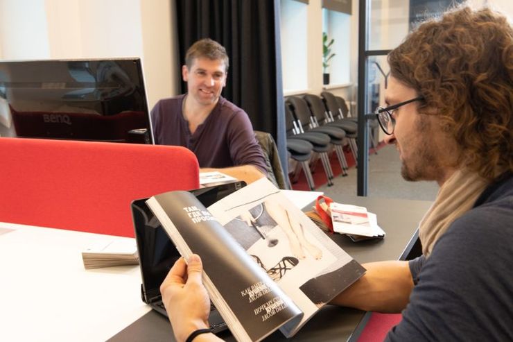 Лаконичная обстановка с яркими акцентами, библиотека образцов, рабочее место с необходимым оборудованием.