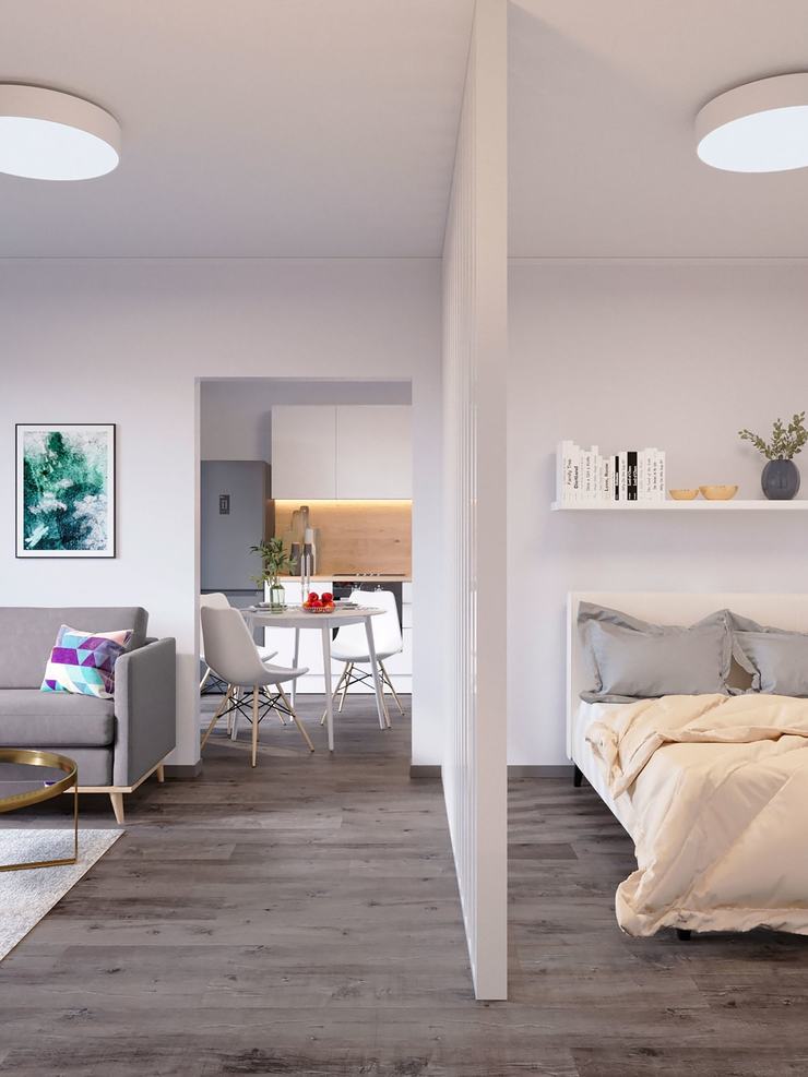 Мебельный пакет для этой же планировки, но для семьи из двух человек без детей будет дополнен двуспальной кроватью с ортопедическим матрасом, а также возведенной декоративной перегородкой для зонирования спального места.