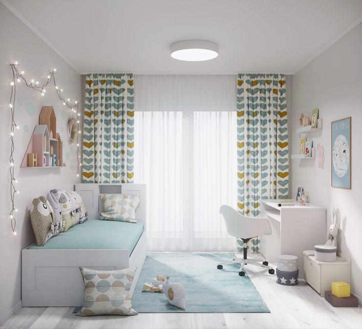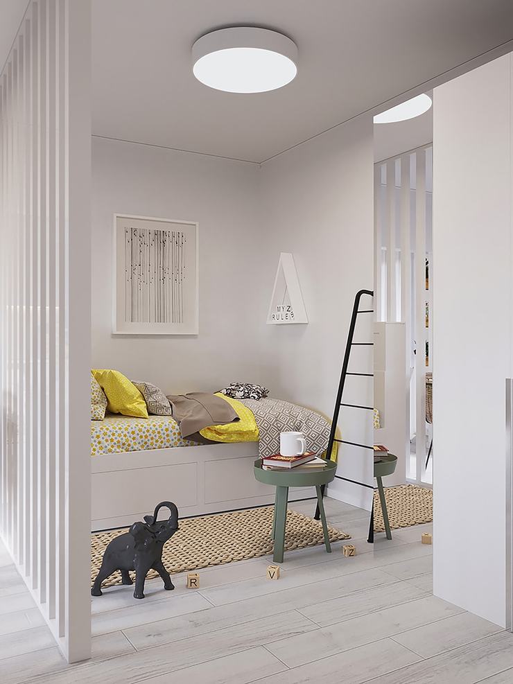 Предусмотрен вариант этой же квартиры, но для семьи с ребенком: дополнительно будет оборудовано спальное место для малыша и установлена детская кровать.