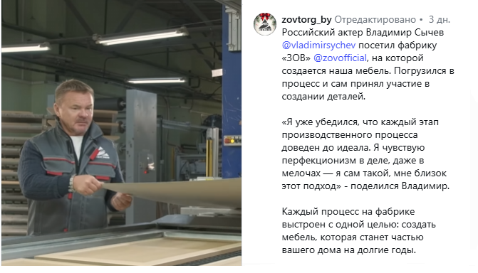 На днях в соцсетях компании появился ролик, где актер рассказывает о своем опыте посещения фабрики. Владимир внимательно наблюдал за каждым этапом создания мебели «ЗОВ» – от обработки материалов до финальной сборки. По собственному признанию, актер принял непосредственное участие в процессе, приложив руку к созданию некоторых деталей.