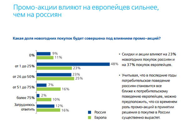 Первая удивительная новость – слабое влияние предновогодних скидок и акций по стимулированию сбыта на объём покупок. Только 23% всех новогодних приобретений россиян были сделаны под влиянием промо-акций. Европейский показатель – 37%. Продавцам мебели это несоответствие говорит в первую очередь о том, что необходимо более внимательно оценивать эффективность стимулирования сбыта как маркетингового инструмента. Возможно, будет выгодно перебросить средства, которые тратятся на скидки, на SMM или контекстную рекламу.