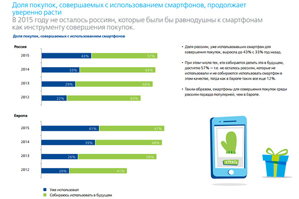 Доля людей, хоть раз совершавших покупки с использованием смартфона, выросла с 33% до 43% за 2015 год. А доля желающих попробовать купить что-нибудь через мобильный телефон выросла до 57% — таким образом, не осталось ни одного россиянина, который бы не хотел совершать покупки со своего смартфона. Наиболее популярные причины использования именно смартфона в качестве инструмента покупок — скорость совершения покупки и возможность сделать покупку в максимально удобное время.